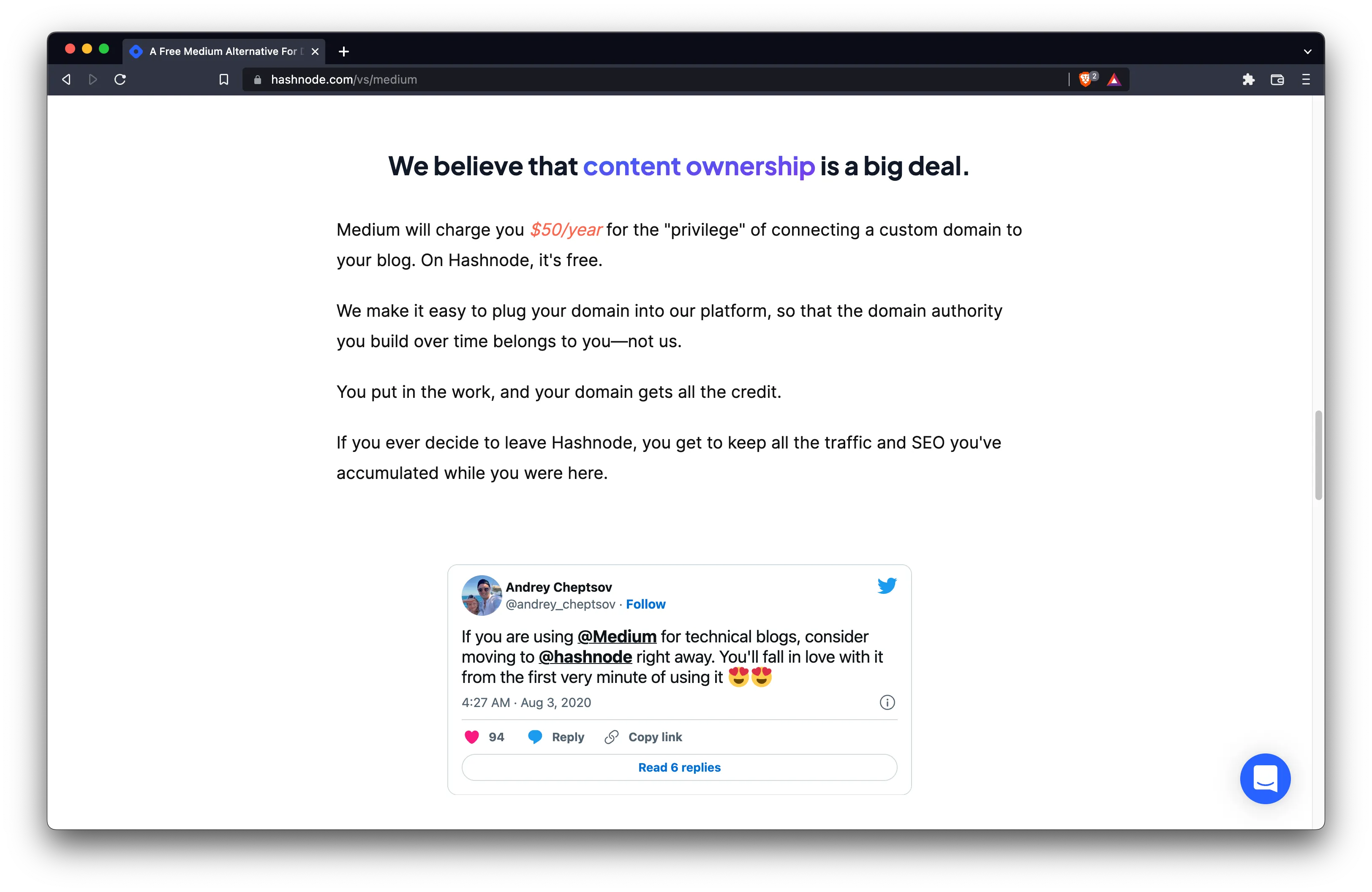 Of course, social proof is crucial for a piece like this. Hashnode had worked hard to cultivate an enthusiastic community on Twitter, so we liberally peppered this page with positive tweets from well-known users on the platform.